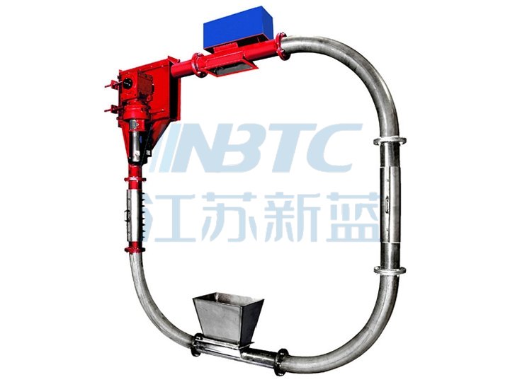 管鏈輸送機(jī)是輸送粉狀、小顆粒狀及小塊狀等散狀物料的連續(xù)輸送設(shè)備,可以水平、傾斜和垂直組合輸送。在密閉管道內(nèi),以鏈片為傳動(dòng)構(gòu)件帶動(dòng)物料沿管道運(yùn)動(dòng)。當(dāng)水平輸送時(shí),物料顆粒受到鏈片在運(yùn)動(dòng)方向的推力。當(dāng)料層間的內(nèi)摩擦力大于物料與管壁的外摩擦力時(shí),物料就隨鏈片向前運(yùn)動(dòng),形成穩(wěn)定的料流;當(dāng)垂直輸送時(shí),管內(nèi)物料顆粒受鏈片向上推力,因?yàn)橄虏拷o料阻止上部物料下滑,產(chǎn)生了橫向側(cè)壓力,所以增強(qiáng)了物料的內(nèi)摩擦力,當(dāng)物料間的內(nèi)摩擦力大于物料與管內(nèi)壁外摩擦力及物料自重時(shí),物料就隨鏈片向上輸送,形成連續(xù)料流。